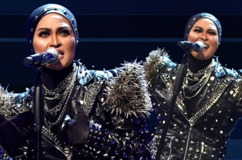 Menerusi persembahannya, Nana memakai dres labuh material kulit yang dipenuhi dengan hiasan paku berwarna silver.