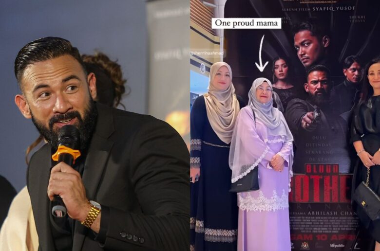 Menerusi perkongsian sama, Sherrini turut memuat naik foto dia dan ibunya iaitu Datuk Marina Puteh turut merakam memori dengan bergambar dengan ‘Sharnaaz’ dalam poster Blood Brothers di luar pawagam.